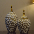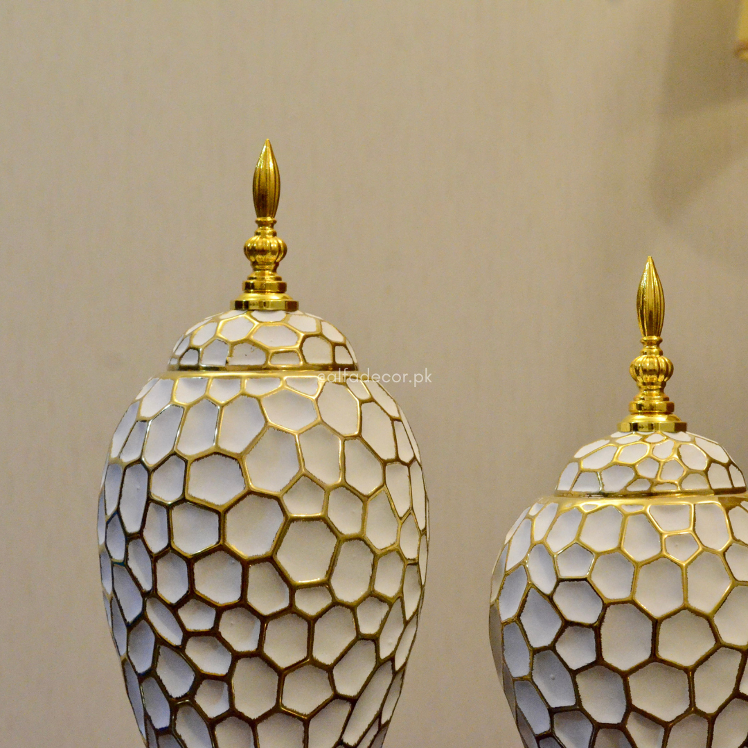 Introducing the Golden Arabic Dunes Urn Set, a stunning addition to any home decor. Crafted with intricate details and a beautiful golden finish, this set will add a touch of elegance to any room. Impress your guests and elevate your space with this exquisite urn set.