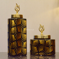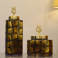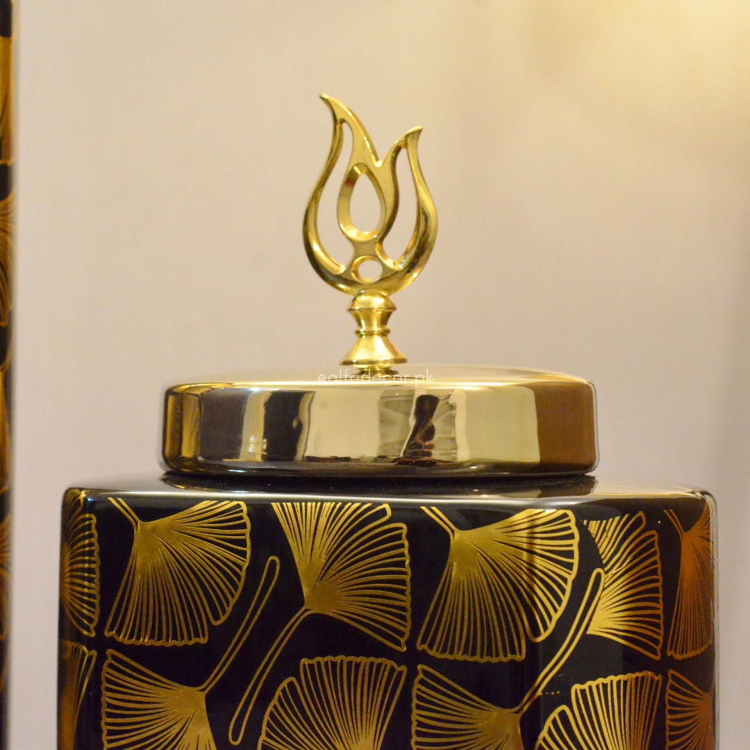 Handcrafted with exquisite detail, these jars feature a glossy black finish adorned with delicate golden ginkgo leaf patterns, symbolizing elegance and longevity. The polished gold lid with a designer finial completes the opulent look, making it a statement piece for any modern interior.