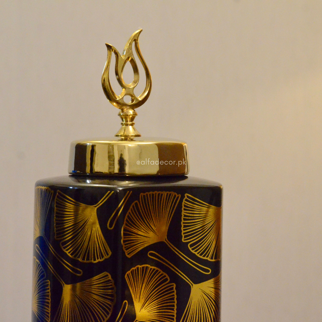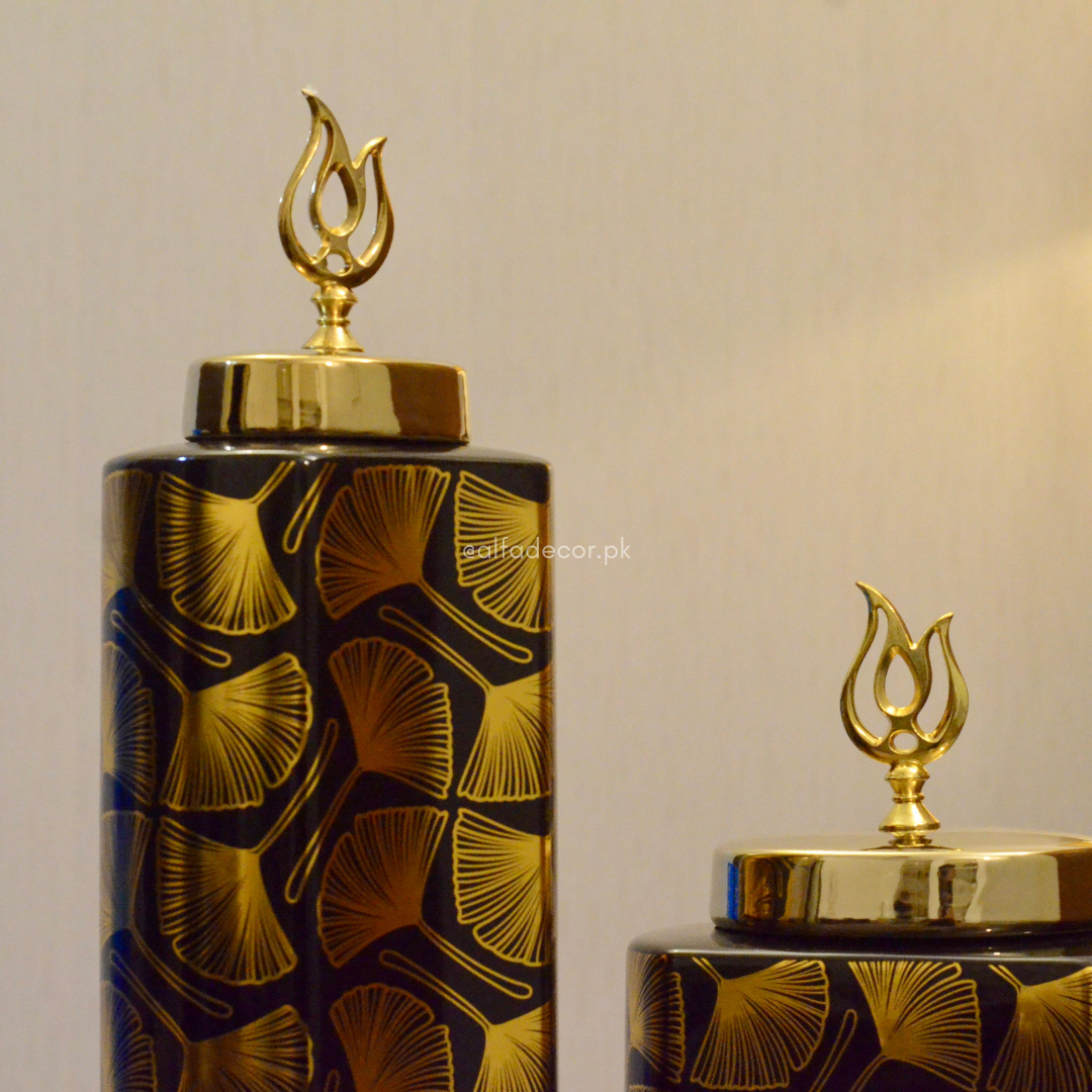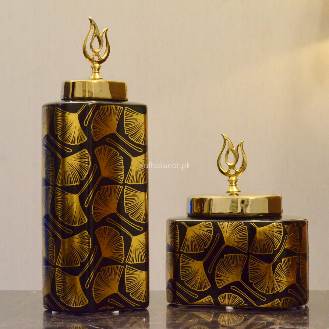 Add a touch of sophistication to your space with Alfa Decor’s Luxury Black & Gold Ginkgo Ceramic Jars.