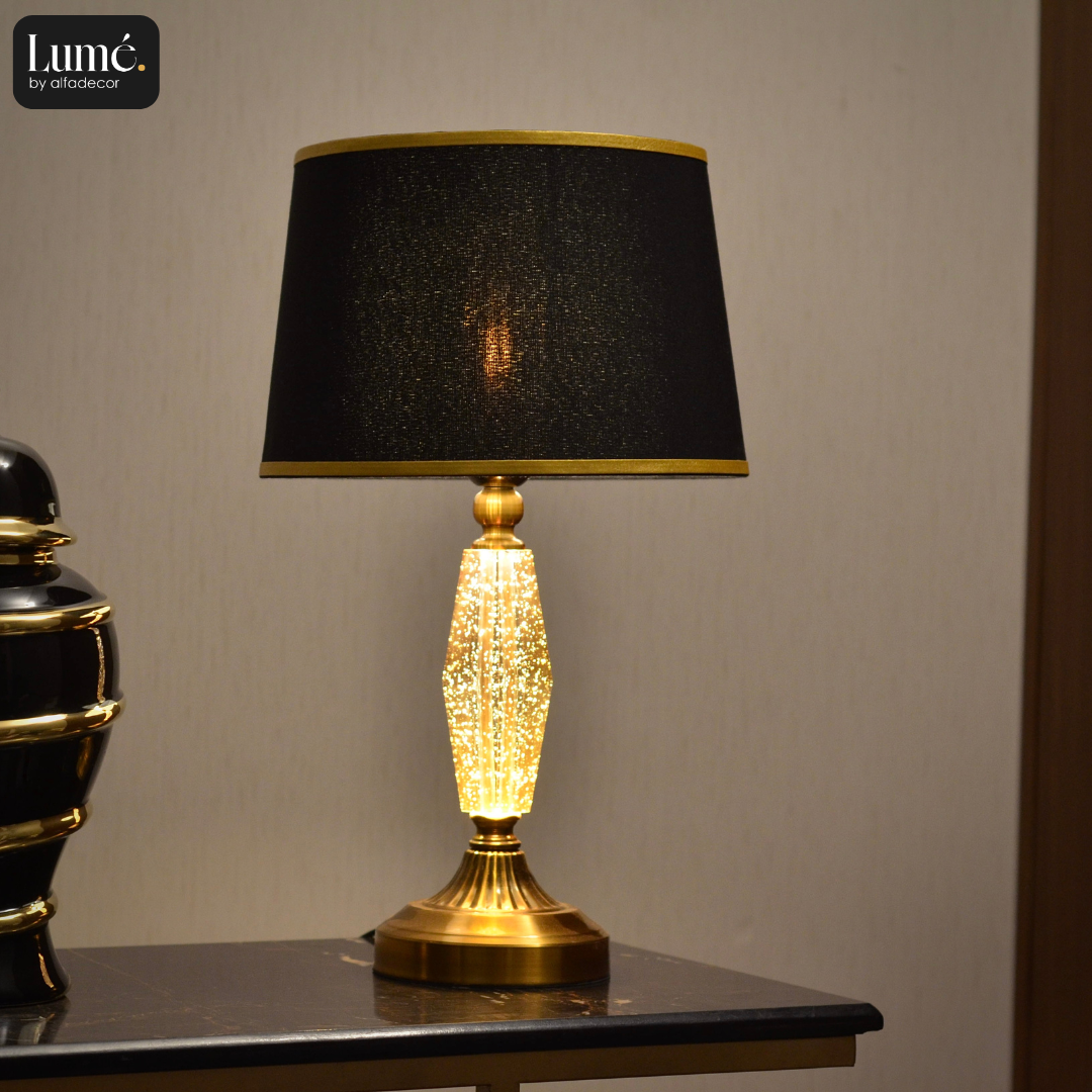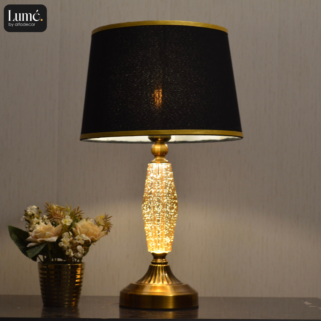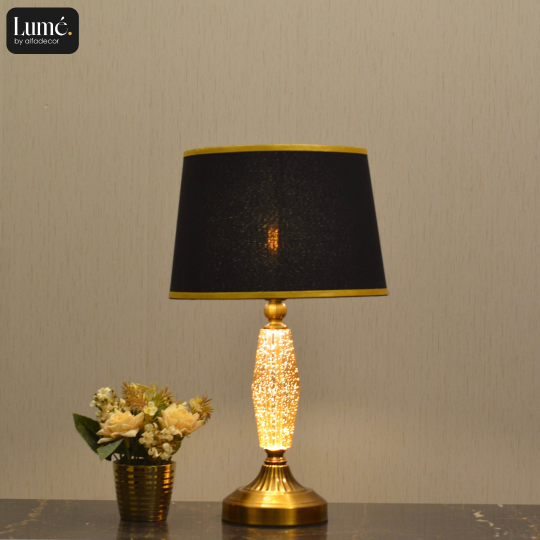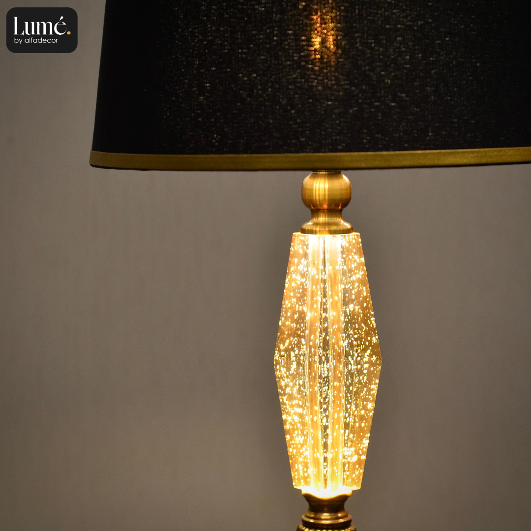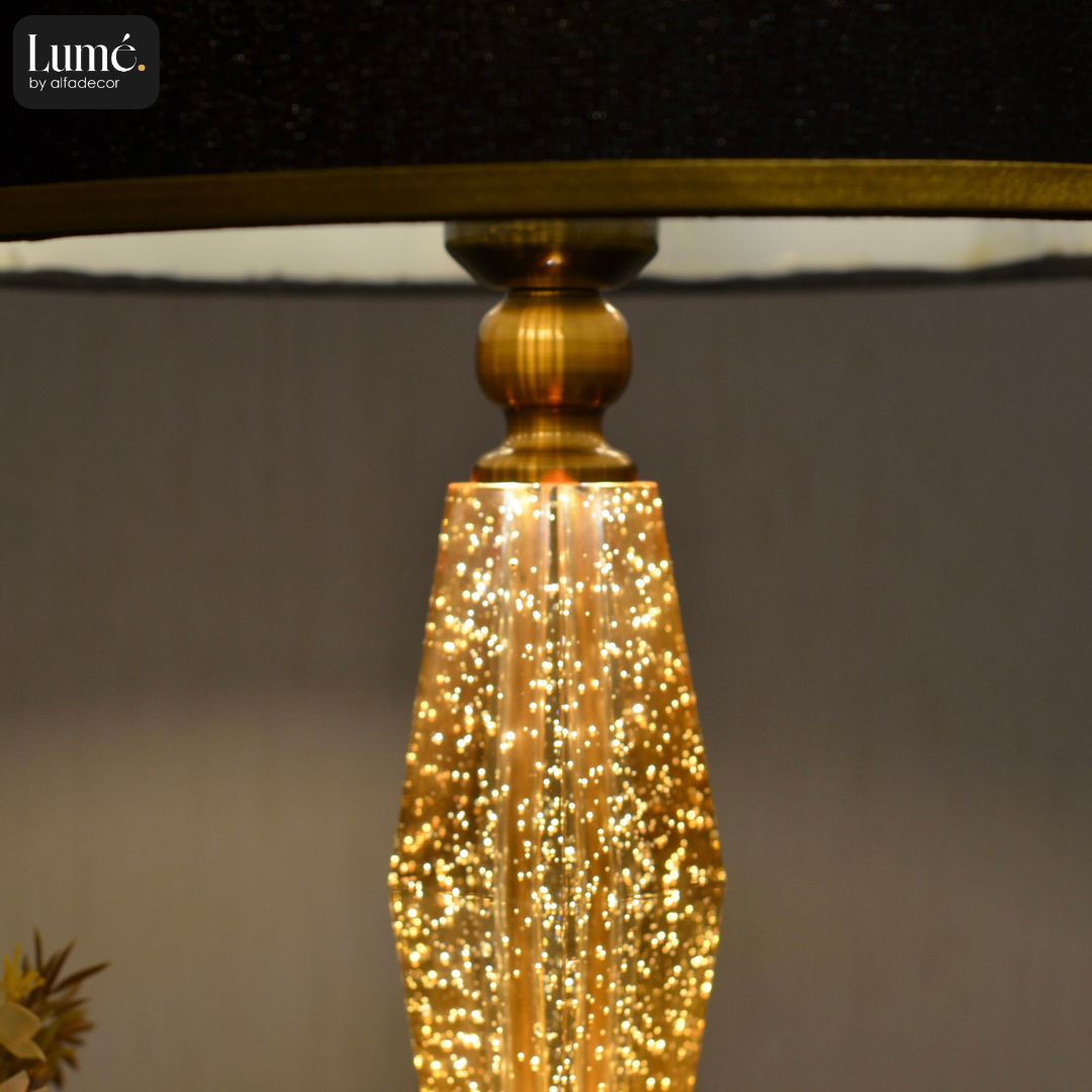 Captivating and glamorous, the Lustre Glow Lamp is a centerpiece of modern luxury. Crafted with a textured glass base that shimmers like liquid light and a golden metal frame, it glows with elegance from every angle. The rich black shade adds dramatic contrast while diffusing warm, ambient light. Perfect for adding depth and sophistication to living rooms or bedrooms, Lustre embodies Lumé’s dedication to refined beauty and craftsmanship. Each piece is designed to elevate your decor — making everyday lighting feel extraordinary.