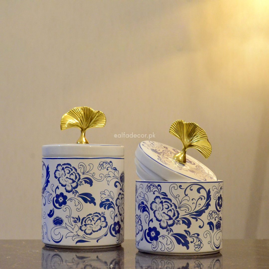 White & Blue Floral Ceramic Jars with Golden Leaf Lid